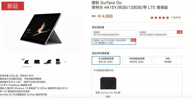 3月4日早间消息,微软中国今日宣布,LTE增强版(4G版)的Surface Go即日起在中国市场正式发售。消费者可在微软中国官方商城进行购买,起售价为4988元。