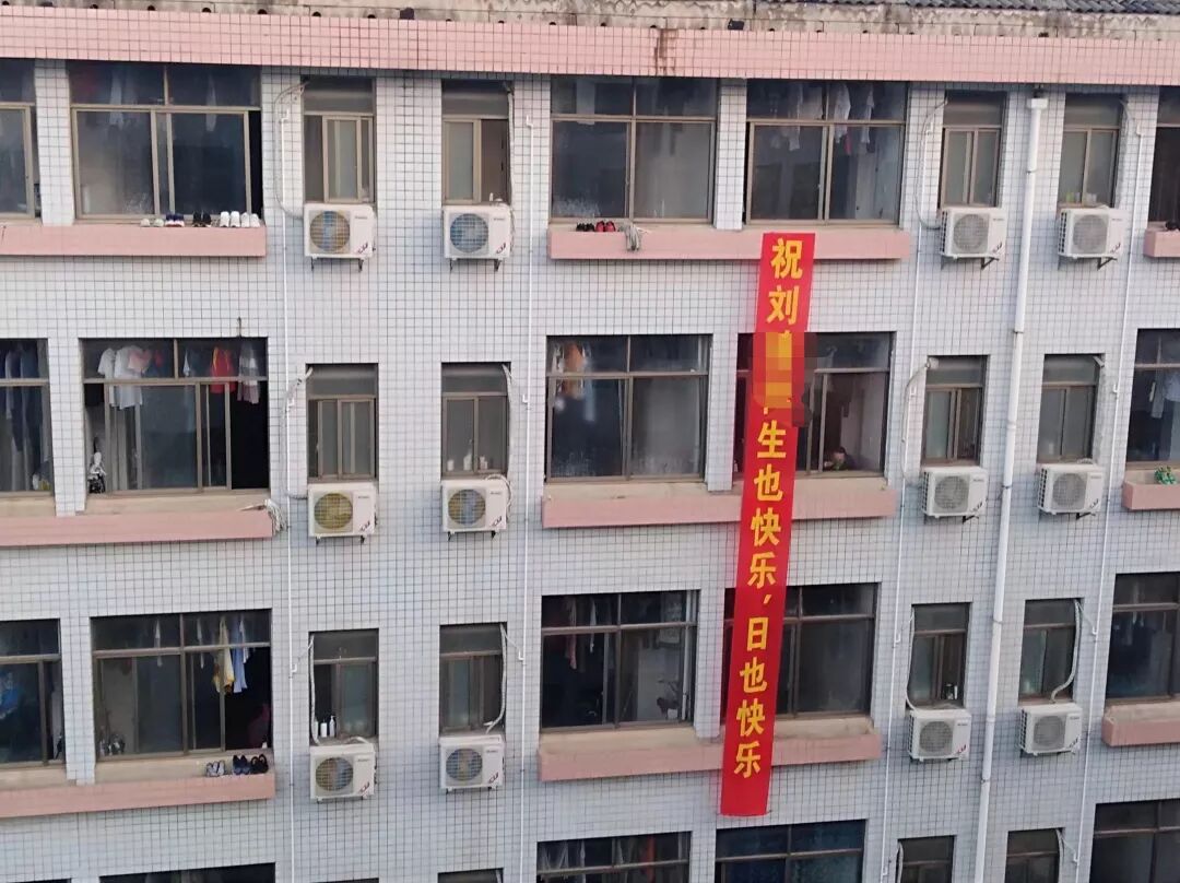 (生日当天舍友给挂的横幅,挂在了女生宿舍楼外面,对面就是男生宿舍楼)