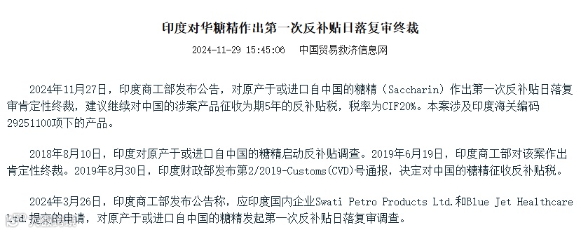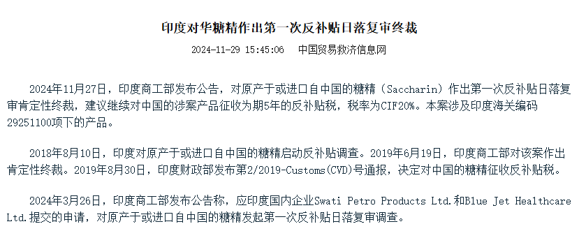 2024年11月27日,印度商工部发布公告,对原产于或进口自中国的糖精(Saccharin)作出第一次反补贴日落复审肯定性终裁,建议继续对中国的涉案产品征收为期5年的反补贴税,税率为CIF20%。本案涉及印度海关编码29251100项下的产品。
