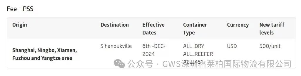 马士基将对中国东部港口(上海,宁波,厦门,福州和长江地区)出发并运往柬埔寨西哈努港的所有的干货和冷藏集装箱,包括45英尺箱,征收旺季附加费(PSS)。