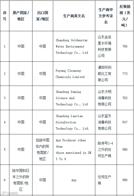 2024年12月10日,印度工商部发布公告,对原产于或进口自中国和日本的三氯异氰尿酸作出反倾销肯定性终裁,建议对上述国家的涉案产品征收为期5年的反倾销税,分别如下:中国为766-986美元/吨、日本为276/吨,征税详情见附表。涉案产品的印度海关编码为29336910和29336990。