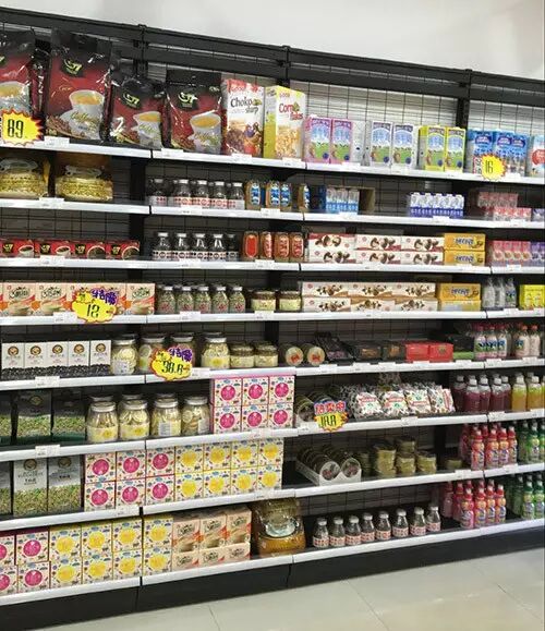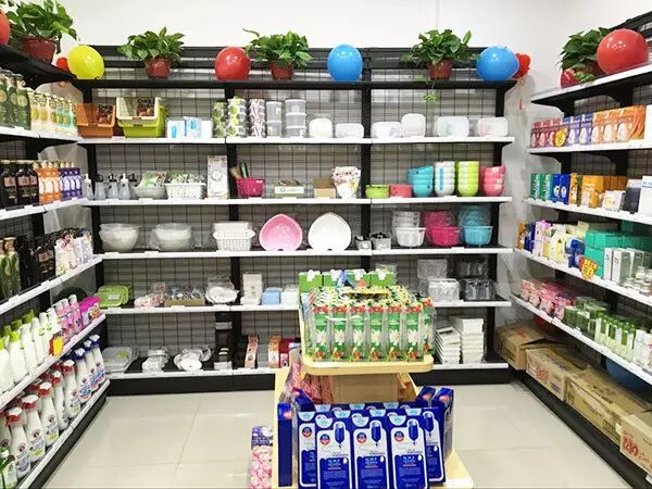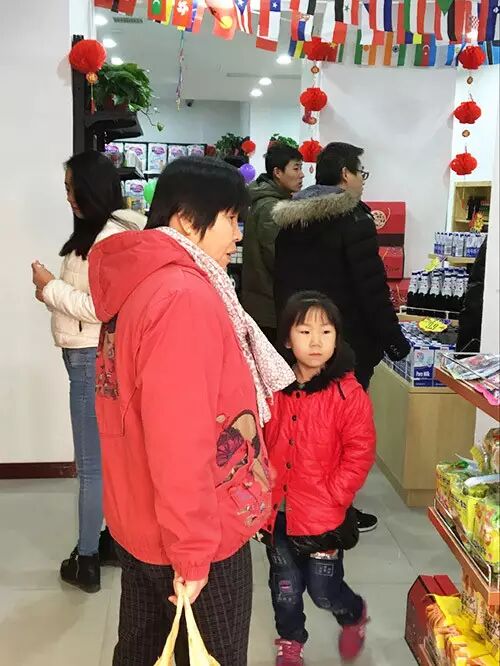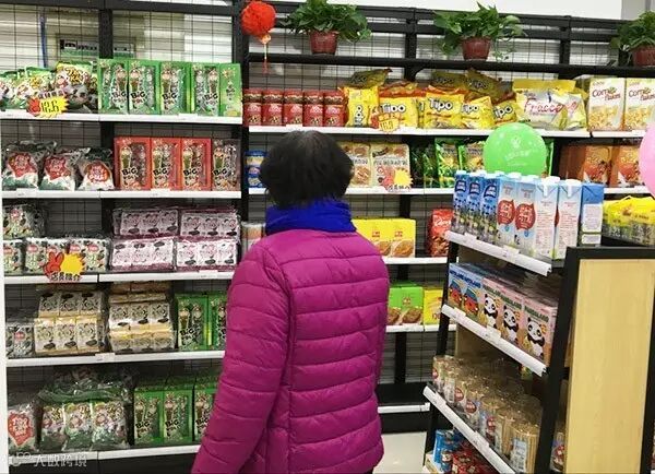 顾客在店内挑选商品,这红衣小姑娘是看上了旁边的零食了吗?
