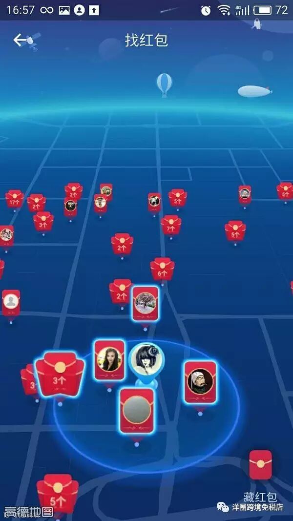 进入AR实景红包后,点击右侧的“红包地图”进入红包地图中,找到洋圈发放的红包(每日发放50个),点进去。