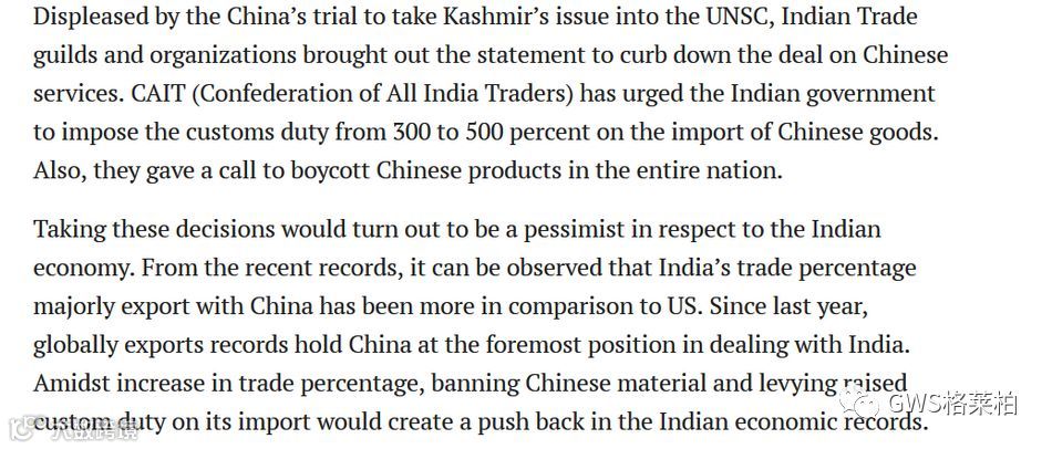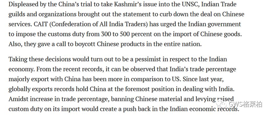 该机构补充称:“中国已习惯于在每一件不利于印度的事情上支持巴基斯坦,因此,现在是时候减少对中国商品的依赖了。”