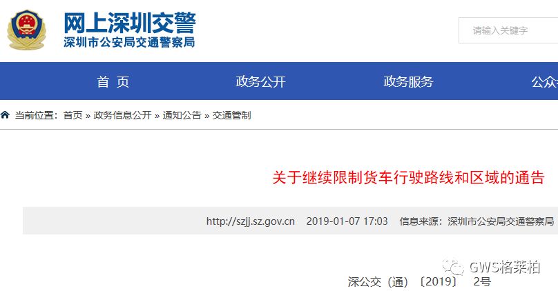 深圳市公安局交通警察局于2019年1月7日发布《关于继续限制货车行驶路线和区域的通告》,对我市部分道路限制货车行驶的时间、路线和区域进行调整。自2019年1月21日至2019年7月20日施行。本通告所称大型货车是指重型或中型货车、牵引车、专项作业车;小型货车是指轻型或微型货车。
