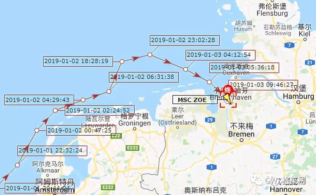 据最初的消息指出,这艘超大型集装箱船“MSC ZOE轮”在1月1日至1月2日夜间,在德国Borkum北部遭遇恶劣天气,导致当时30多个集装箱丢失,该船正从葡萄牙Sines前往德国的不来梅港。