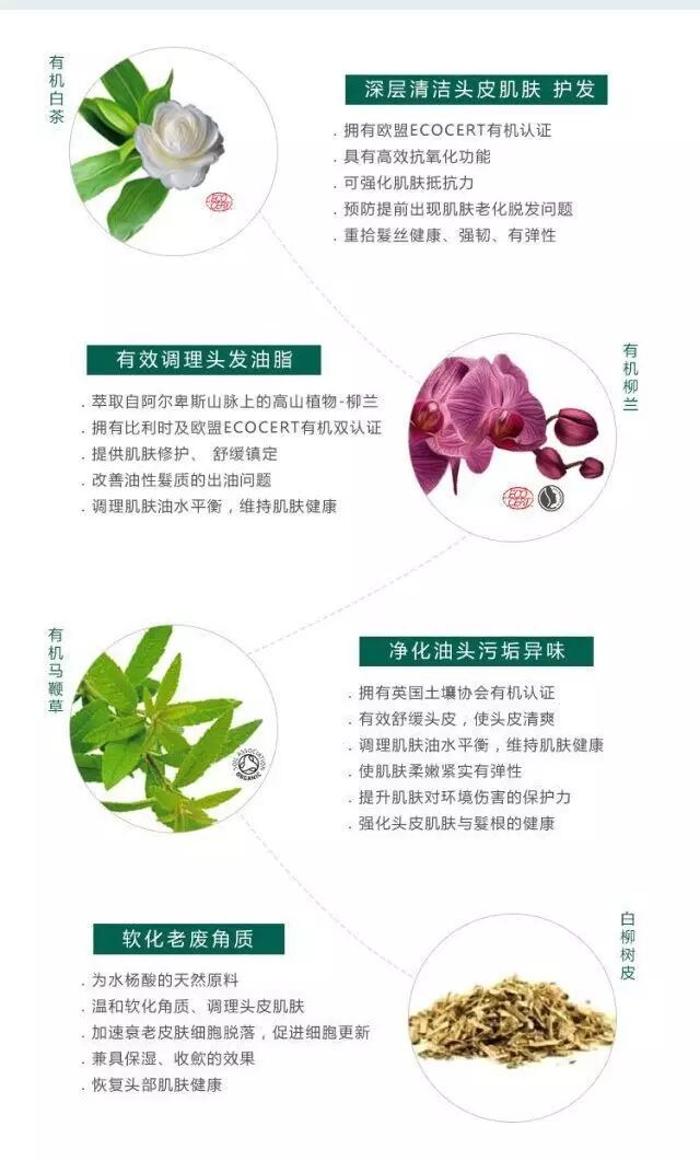 首先,成分必须天然。都是用白茶、柳兰、柠檬马鞭草、白柳树皮等草本成分,达到深层清洁头皮肌肤、有效调理头发油脂、净化油垢异味、软化去除老化角质的功效。清洁、除垢、去角质、除异味,一支到底,轻松搞定。