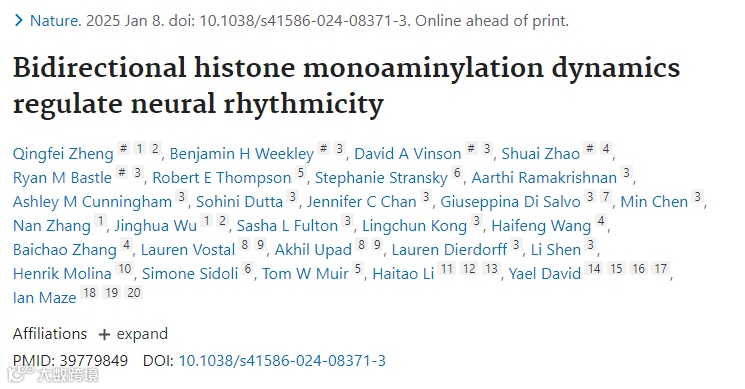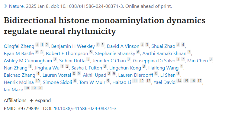 Zheng, Q., Weekley, B.H., Vinson, D.A. et al. Bidirectional histone monoaminylation dynamics regulate neural rhythmicity. Nature (2025). doi:10.1038/s41586-024-08371-3