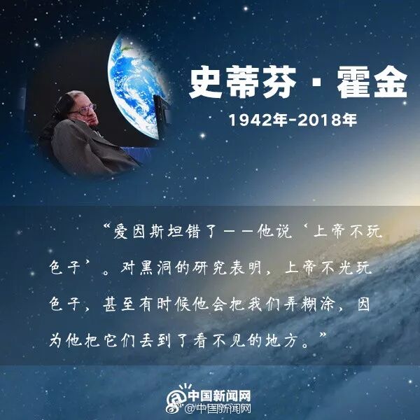 “爱因斯坦错了——他说‘上帝不玩色子’。对黑洞的研究表明,上帝不光玩色子,甚至有时候他会把我们弄糊涂,因为他把它们丢到了看不见的地方。”