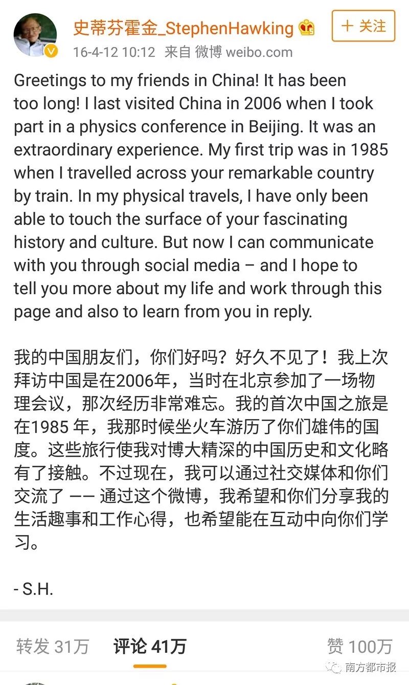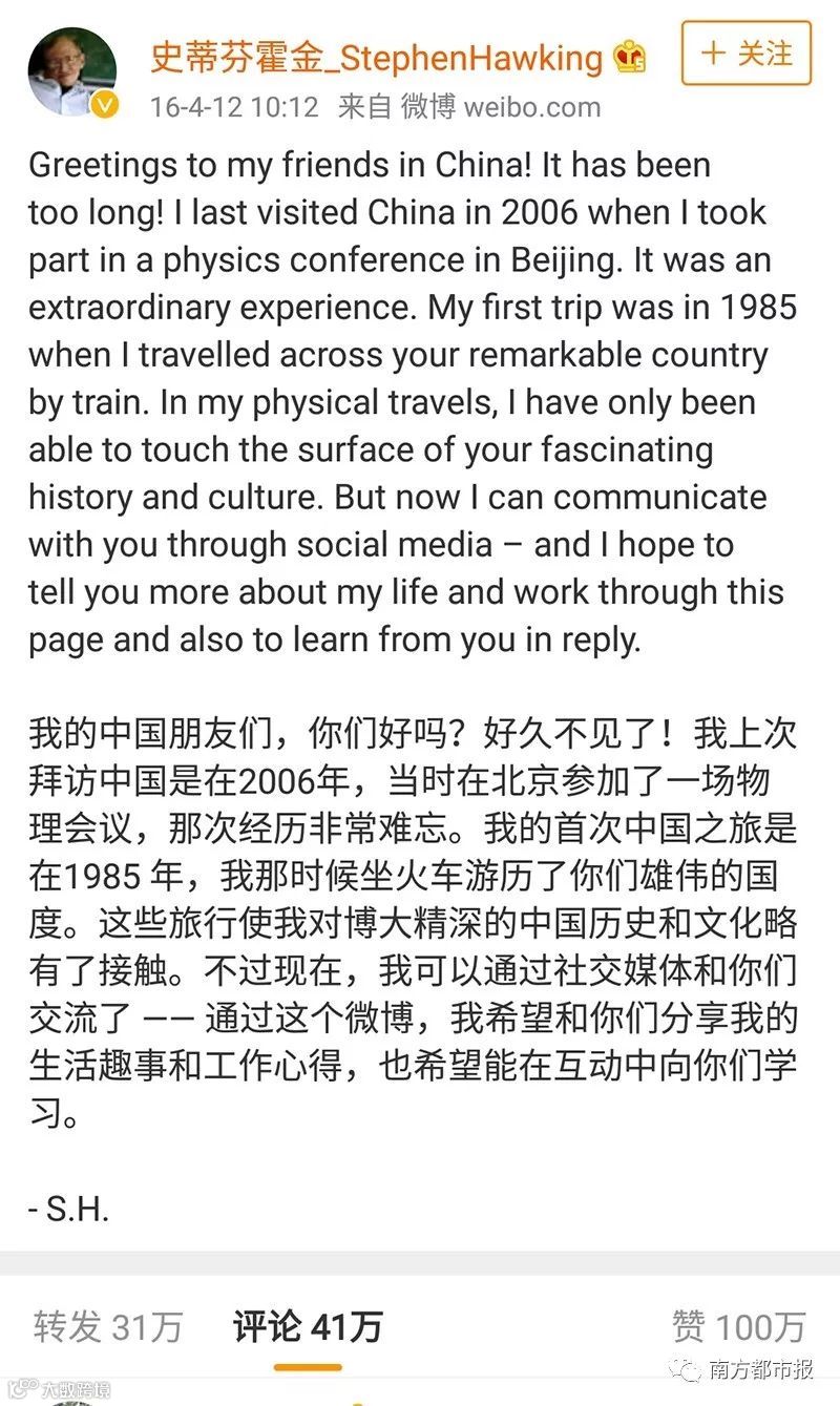两年前,2016年4月12日,霍金启用了新浪微博账号。中国网友迎来了这位宇宙无敌大咖级别的微博好友。当天上午10时12分,霍金发出第一条微博: