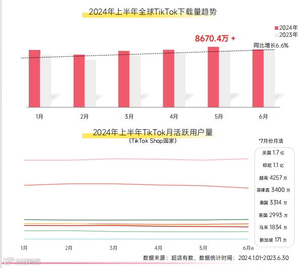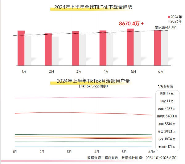2024年上半年,TikTok全球月均下载量达到8173万次,同比去年上升6.6%。庞大的用户群体和高度活跃的内容,让越来越多的创作者和品牌开始关注如何通过TikTok实现品牌和销售双增长。