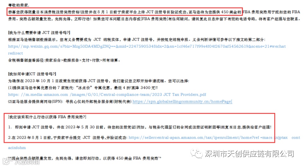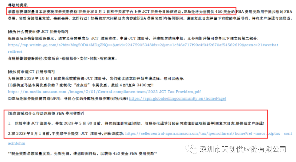 恭喜您获得限量日本消费税注册奖励资格!注册并在8月1日前于卖家平台上传JCT注册号且验证成功,亚马逊将为您提供450美金的FBA费用奖励用于抵扣您的FBA费用。奖励名额限量发放,先到先得,立即行动!如果您对本问题日志内容或【FBA费用奖励】有任何疑问,请回复此日志并留下有效的电话号码,将有客户经理与您联系。