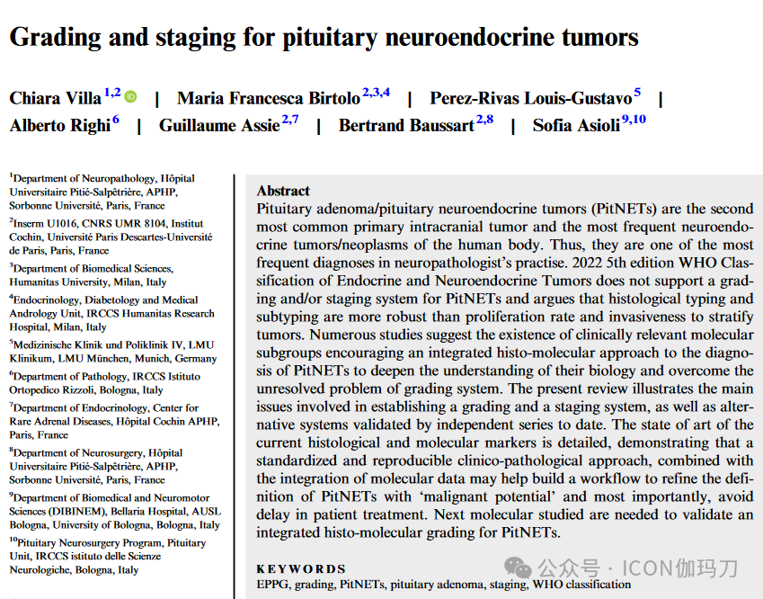 《Brain Pathology》杂志 2024年8月25日在线发表法国、德国、意大利的Chiara Villa , Maria Francesca Birtolo , Perez-Rivas Louis-Gustavo ,等撰写的《垂体神经内分泌肿瘤的分级和分期。Grading and staging for pituitary neuroendocrine tumors》(doi: 10.1111/bpa.13299.)。