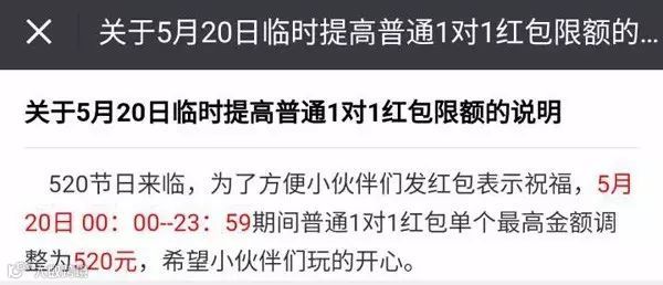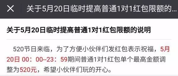 微信红包今日(5月20日)发布公告称,为了方便小伙伴们发红包表示祝福,今日00:00-23:59,普通1对1红包单个最高金额调整为520元。还“希望小伙伴们玩的开心”。