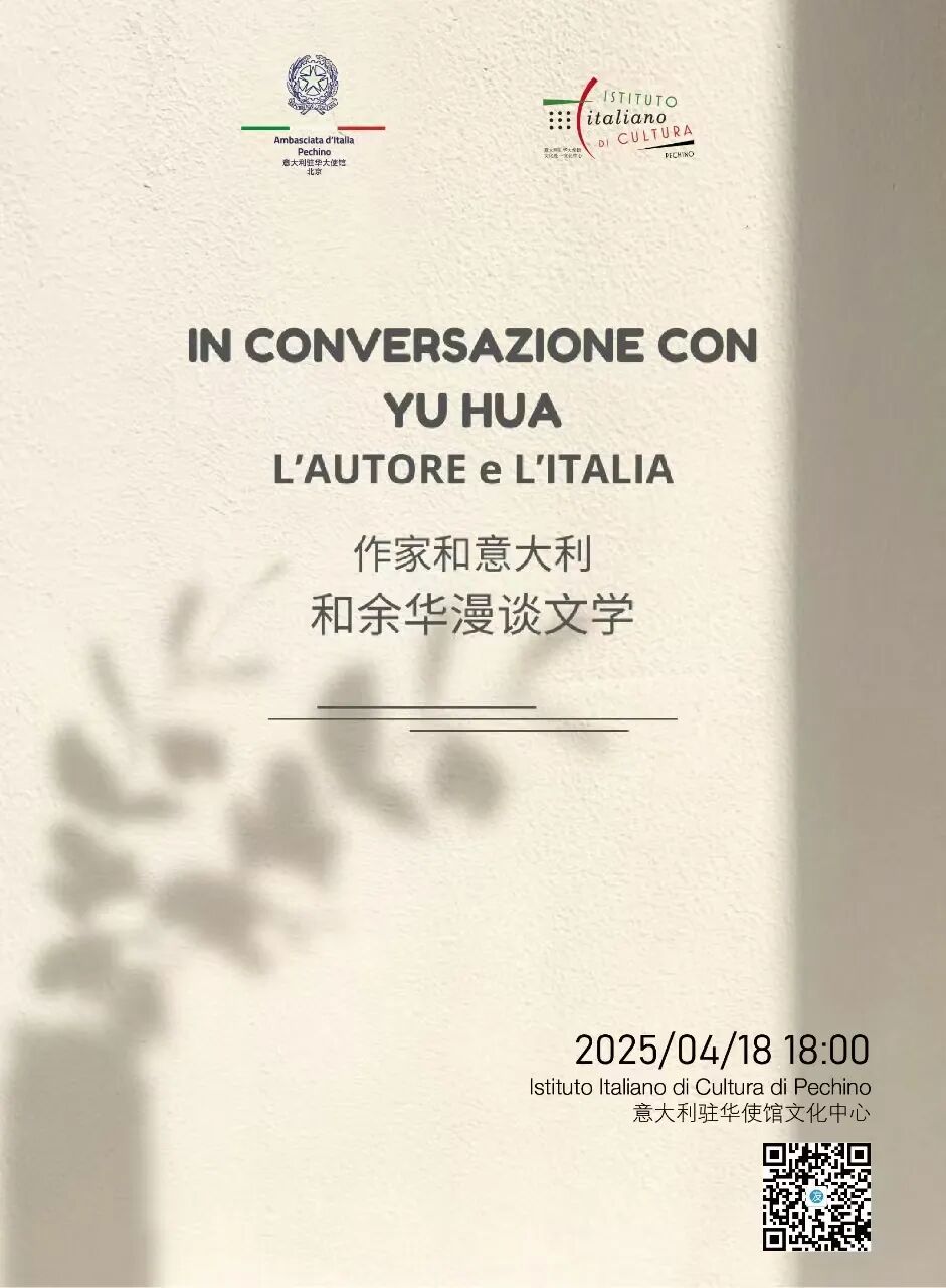 意大利大使馆文化中心高兴地邀请各位来参加与余华的交谈,他是中国当代文学大家,将与读者分享他的文学创作以及他与意大利的交往。