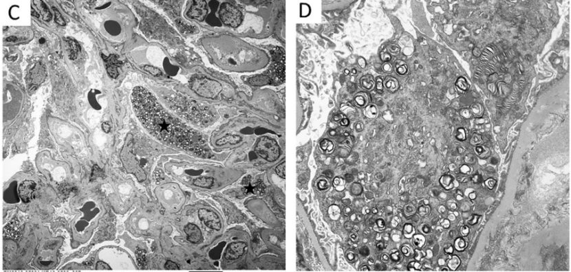 电镜下可见多个足细胞内含有髓样小体(图 C 和 D),伴足细胞轻至中度足突融合,影响约 30% 的周围毛细血管表面区域。内皮细胞、系膜细胞、肾小管周围毛细血管或肾小管细胞内未见髓样小体。肾小球基底膜内未见串珠状胶原纤维。