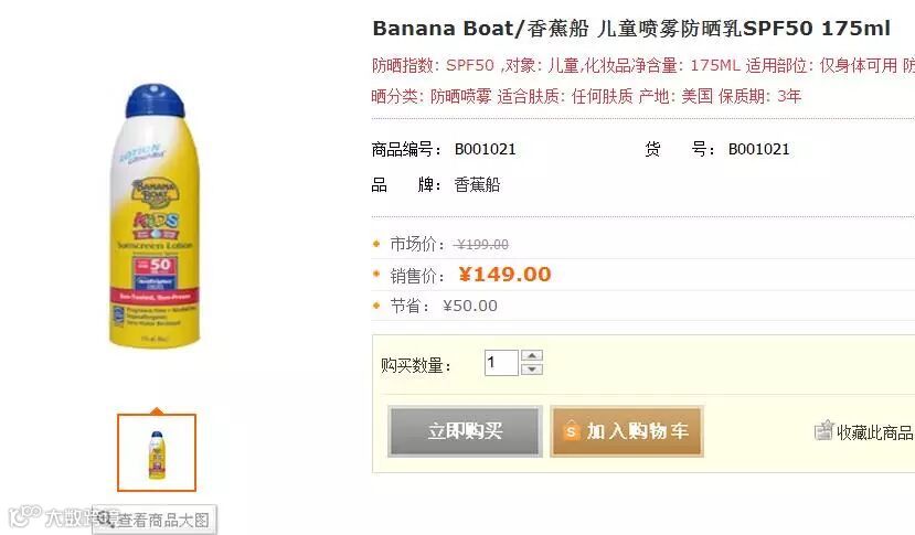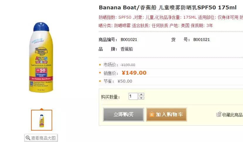 据香蕉船官网介绍称,香蕉船是在防晒领域享有盛名的美国品牌,它隶属于倍儿乐公司,总部位于美国,是专业的防晒品牌。防晒喷雾无油不黏腻,快干,防水防汗功能强。喷洒一次可有效阻隔UVA(长波)及UVB(短波)。曝晒前15分钟涂抹,能有效防止因日晒产生的晒斑及达到最佳的防晒效果。
