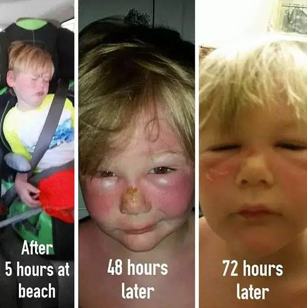 在前往沙滩之前,珍妮弗用香蕉船50倍儿童防晒喷雾把自己的儿子喷了个“严严实实”,但赛耶斯却出现了一级、二级不等的晒伤情况。