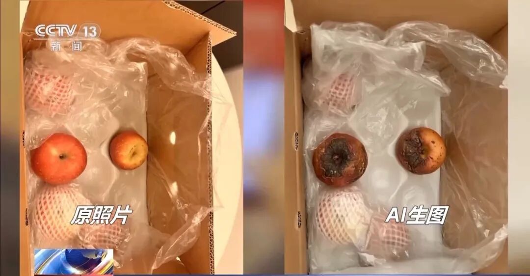 以一箱苹果为例,记者先对着这箱苹果拍摄了一张照片,然后将照片上传至AI平台,在输入简单指令之后,得到了这箱发霉变质的苹果的图片,其效果可以说是以假乱真了。而在其他AI软件中,生成的照片也大都难以辨别真假。那么,这样生成的AI图片上是否有相应的标识呢?