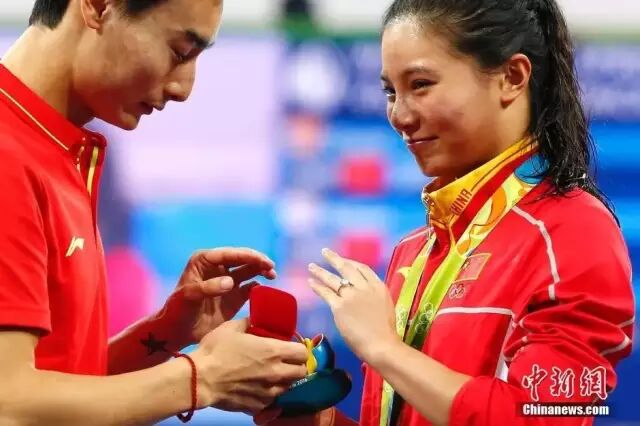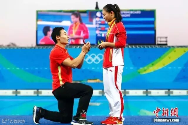 4年之后,在颁奖仪式结束后,以跳水池为背景,中国男子跳水运动员秦凯上前,单膝跪地向何姿求婚,何姿感动落泪,点头答应并戴上戒指。其他国家参赛运动员纷纷上前,向这对眷侣表达祝贺。浪漫!6年的爱情长跑,再次恭喜何姿,祝福这对跳水情侣!