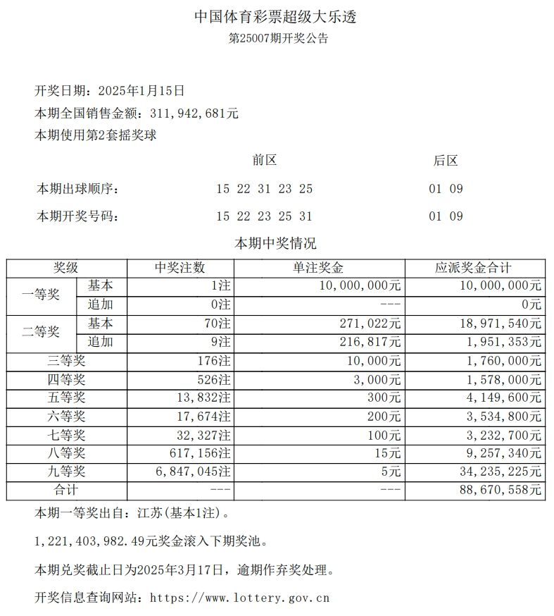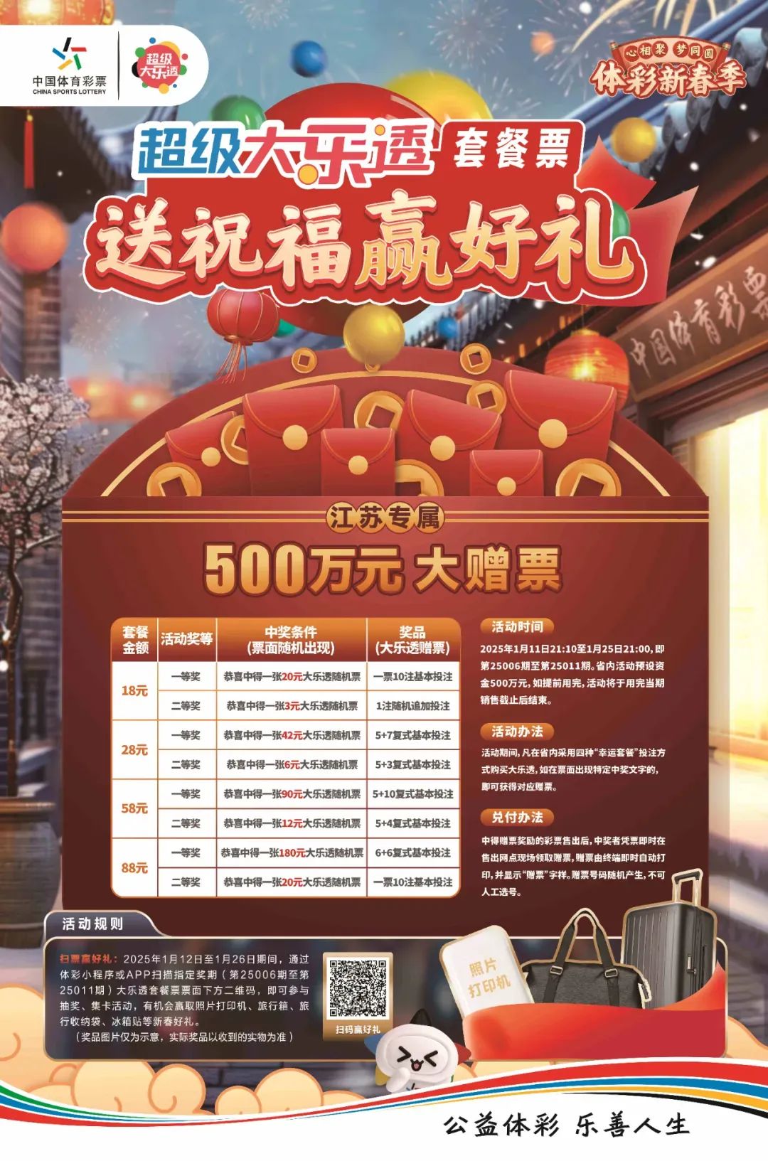 江苏体彩开展的大乐透套餐票500万元大赠票活动,将持续至大乐透第25011期(2025年1月25日晚开奖),预计6期。活动期间,在江苏省内销售网点采用四种“幸运套餐”(18元、28元、58元、88元)投注方式购买大乐透,如在票面出现中奖文字的,即可获取对应赠票奖品。