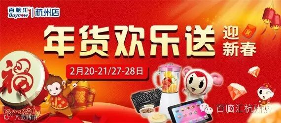 关注百脑汇杭州店微信,凭购物小票即可免费抽奖,有机会赢得平板、机械键盘、U盘、榨汁机、羊年公仔等精美礼品,百分百中奖!