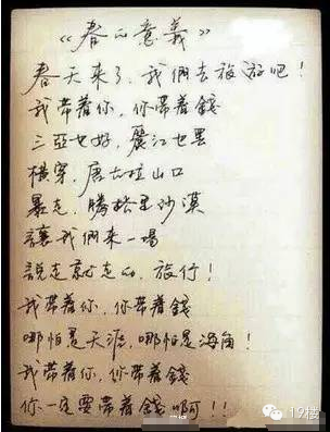 出处:据说,这句话是一位上海的妈妈给正在上大学的孩子写了首诗,原诗是“春天来了,我们去旅游吧!我带着你,你带着钱,三亚也好,长江也罢,横穿唐古拉山口,暴走腾格里沙漠。让我们来一场说走就走的旅行!我带着你,你带着钱,哪怕是天涯,哪怕是海角!”高大上的诗意遇上“你一定要带着钱”的现实,不少网友读着读着就乐了。