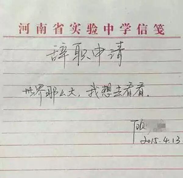 出处:4月14日,一份辞职申请被发到网上,上面只有10个字:“世界那么大,我想去看看。”网友称其“史上最具情怀的辞职申请”。