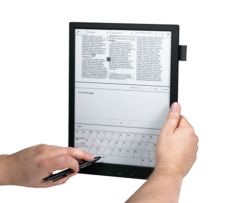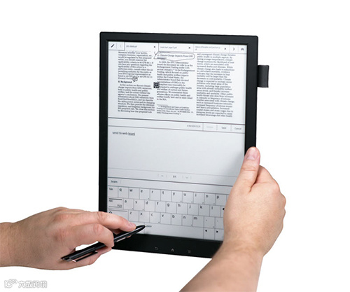 相当于A4纸大小的世界最薄最轻的电子纸终端!让人类再次上演电影版的画面,感叹科技的伟大吧!采用E Ink屏幕,厚度只有6.8mm,重量仅为358克。阅读和书写就像在纸上一样,写上的东西可保存下来随时调取,也可使用其他电脑及移动设备打开。