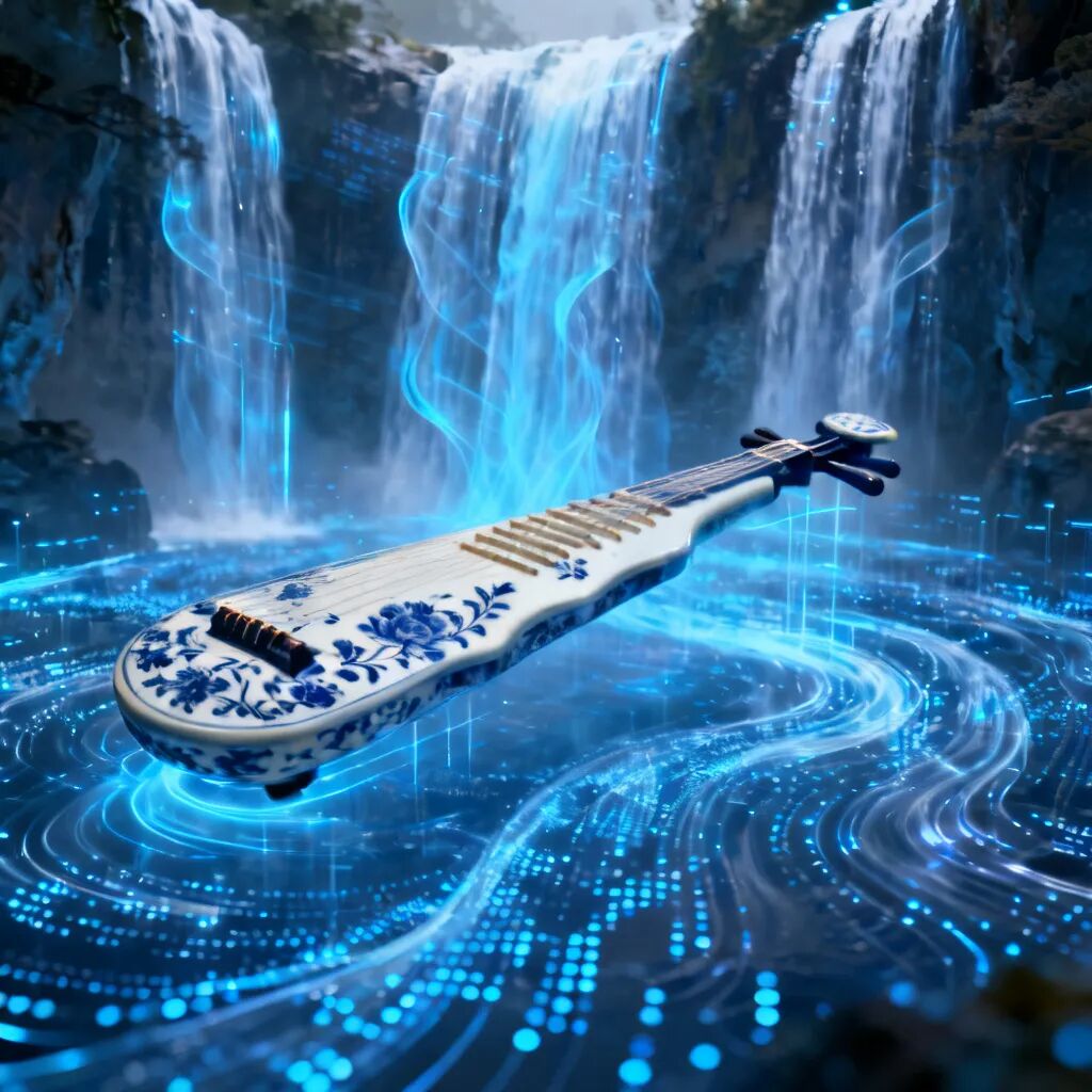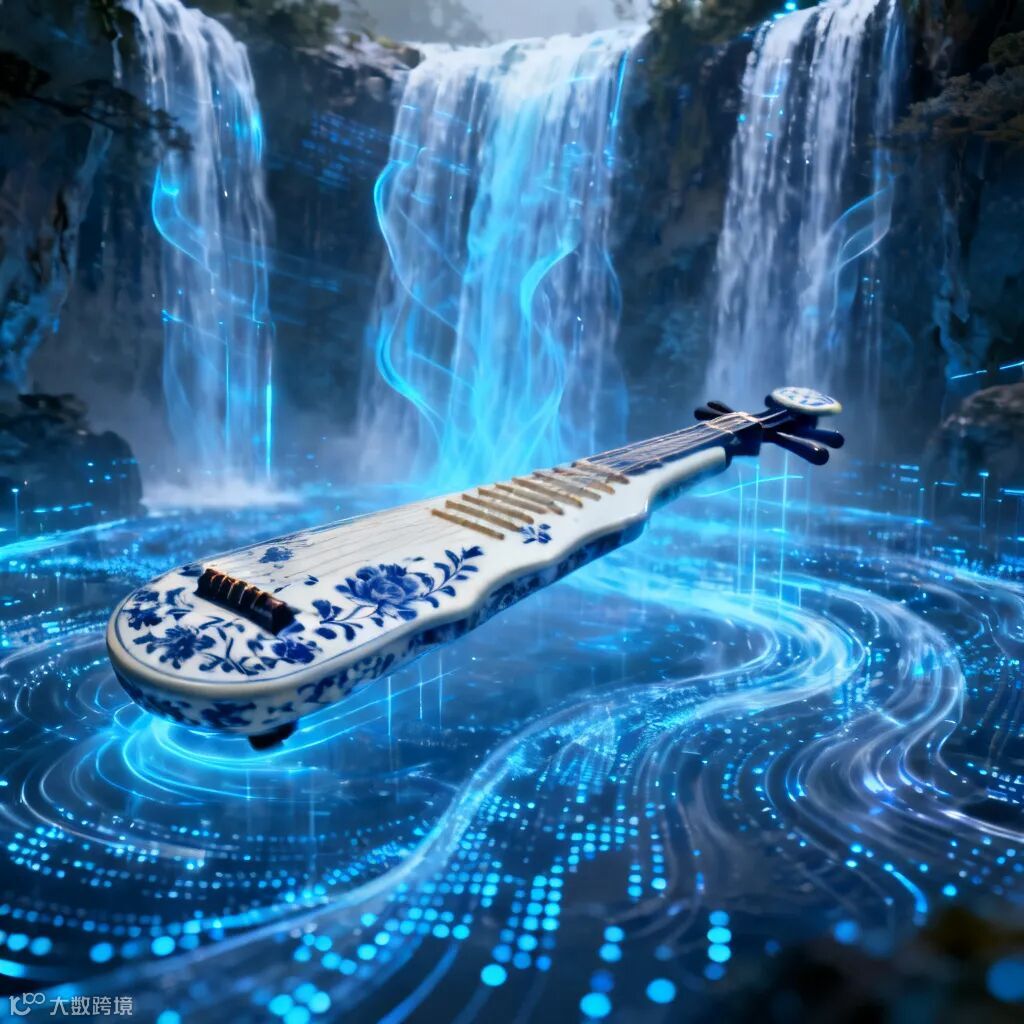 青花瓷古琴漂浮于数据海洋中,四周涌动全息瀑布