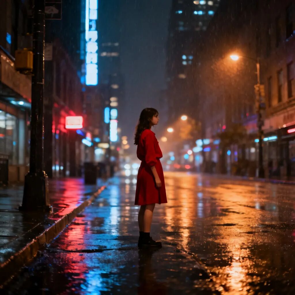 "红衣女孩,孤独伫立于雨夜街头,霓虹灯微闪,镜头拉远渐虚焦"