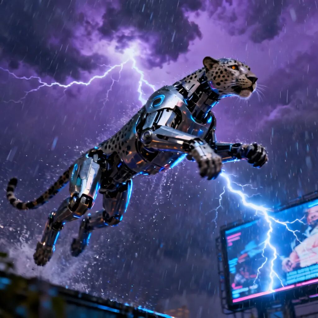 "生锈的机械猎豹,在暴雨中跃过广告牌,金属裂缝闪电弧光,广角仰拍+慢镜头"