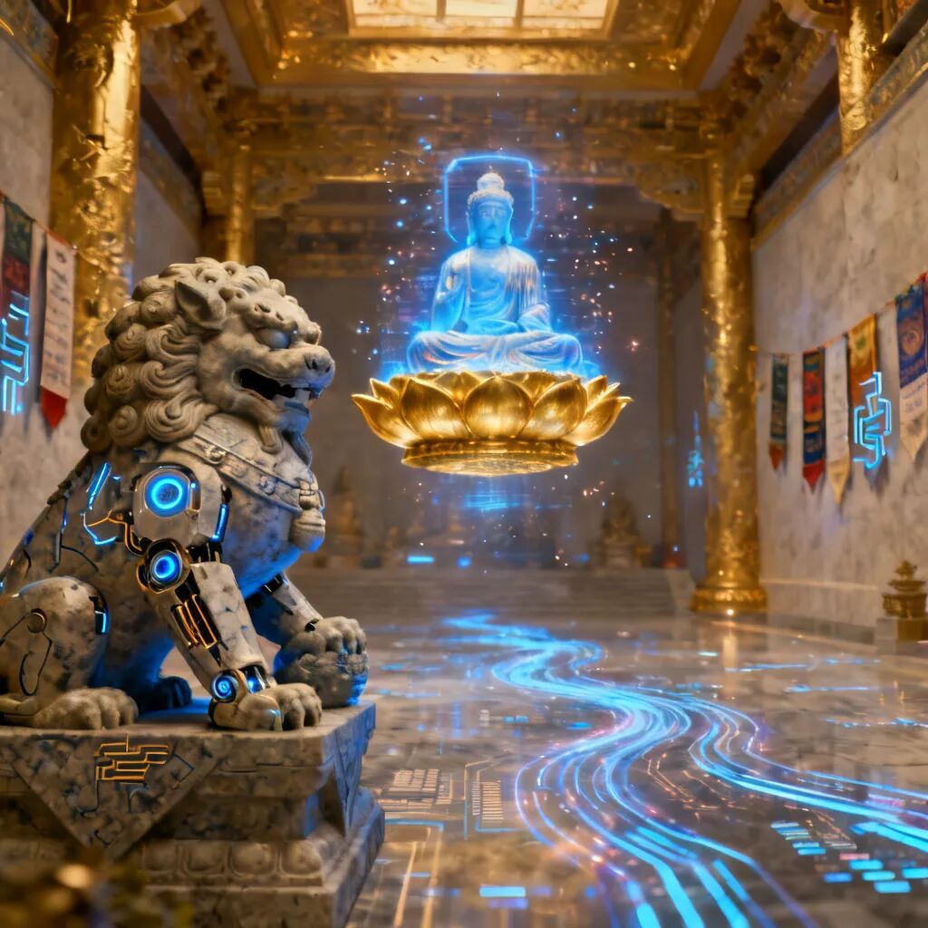 "赛博纹理石狮,守卫数字佛堂,每声咆哮震碎数据病毒"
