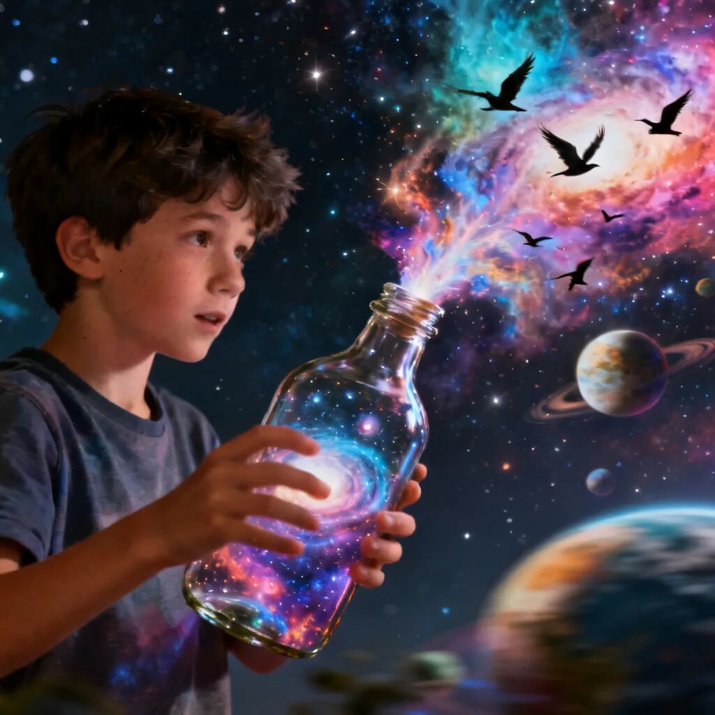 "玻璃瓶中的静止星系 → 少年摇晃 → 星球碰撞生成星云 → 星云飞出瓶口化作飞鸟"