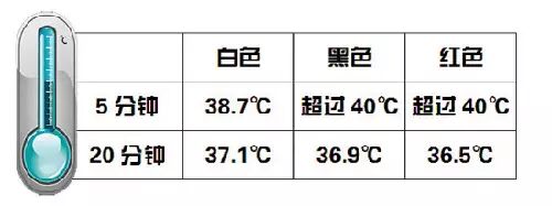 暴晒5分钟以内,白色T恤的温度明显要低于黑色T恤和红色T恤;红色T恤在晒足20分钟之后,温度相对于白色T恤和黑色T恤的反而要低,白色的防晒效果最差。