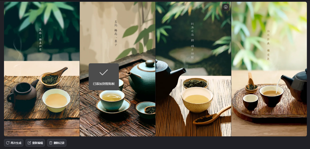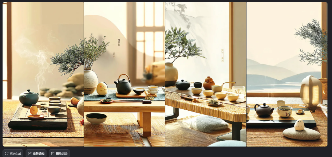 我们输入提示词,并上传一张参考图,让AI生成一套具有相似风格的餐具图片。