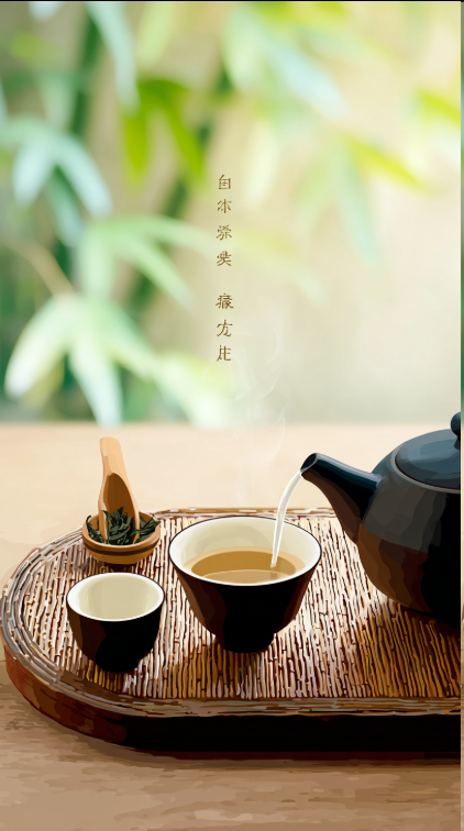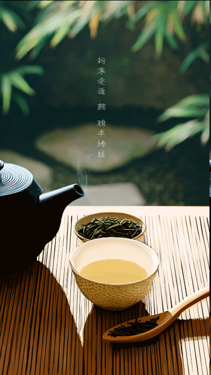 “参考附件风格给我一套餐具的图片,要求布局惬意安适,背景是极简化的竹子庭院,这套茶具摆放在竹子编制的茶几上,桌上有小和尚茶宠,茶叶放在茶匙中,突出茶叶的鲜绿可口,需要使用到附件画面中的茶杯和茶壶”。