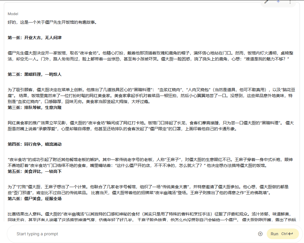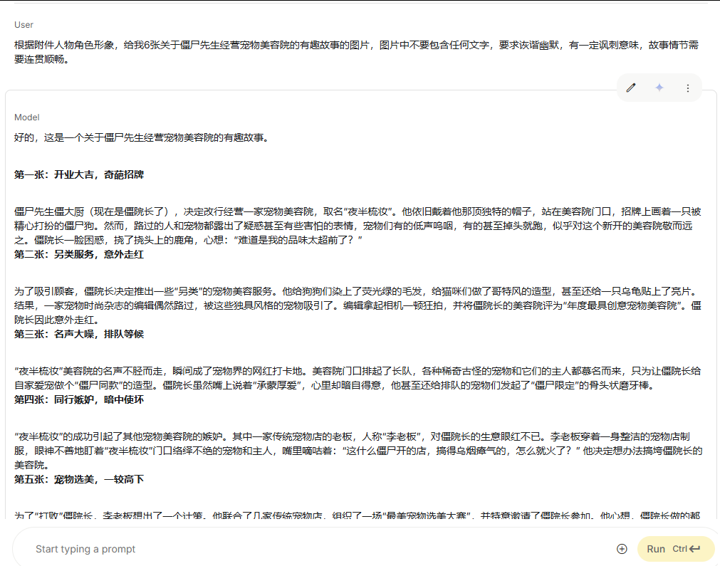 基于这个工作流程,我们还可以继续创作同一人物在不同故事背景下的内容。例如,输入新的提示词:“根据附件人物角色形象,给我6张关于僵尸先生经营宠物美容院的有趣故事的图片,图片中不要包含任何文字,要求诙谐幽默,有一定讽刺意味,故事情节需要连贯顺畅。”