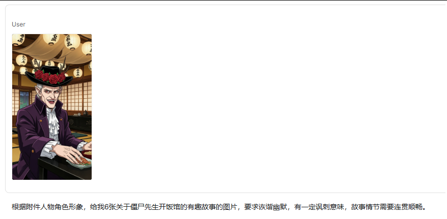 然后我们上传之前制作好的人物角色图片,并输入提示词,要求模型生成一个连贯的漫画故事。