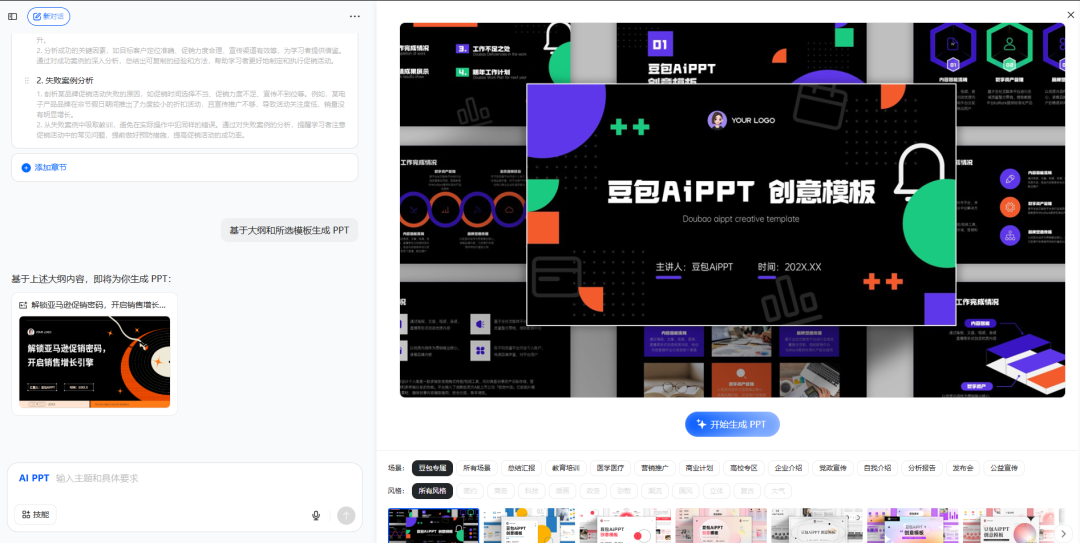 生成大纲后,可以进行调整或添加新的章节需求。如果对大纲满意,就可以选择模板了。豆包中提供了非常丰富的模板可供选择使用。