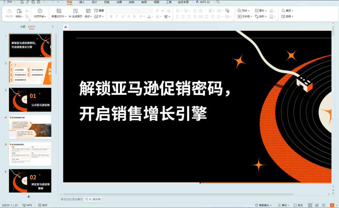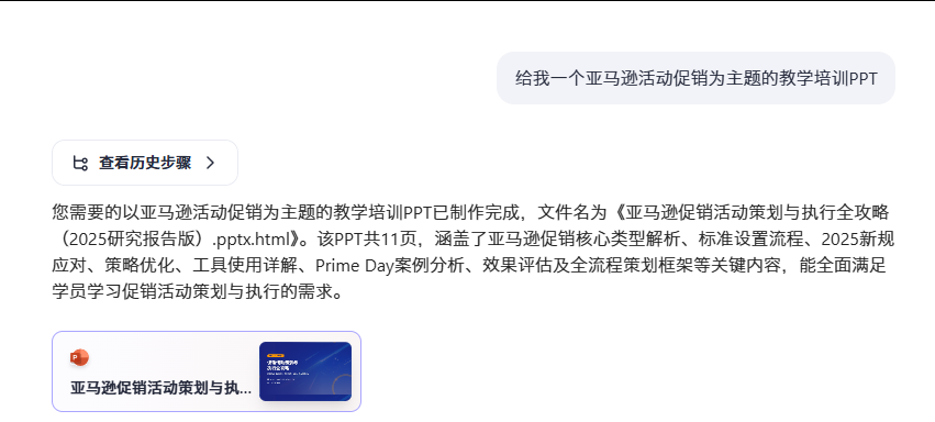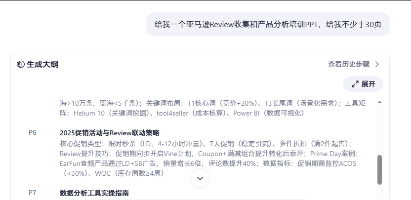 然后输入提示词“给我一个亚马逊活动促销为主题的教学培训PPT”,豆包就会立即生成一个PPT的大纲。