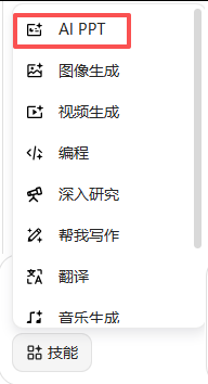 首先,我们使用豆包进行制作。在豆包APP的对话框中选择AI PPT技能项。