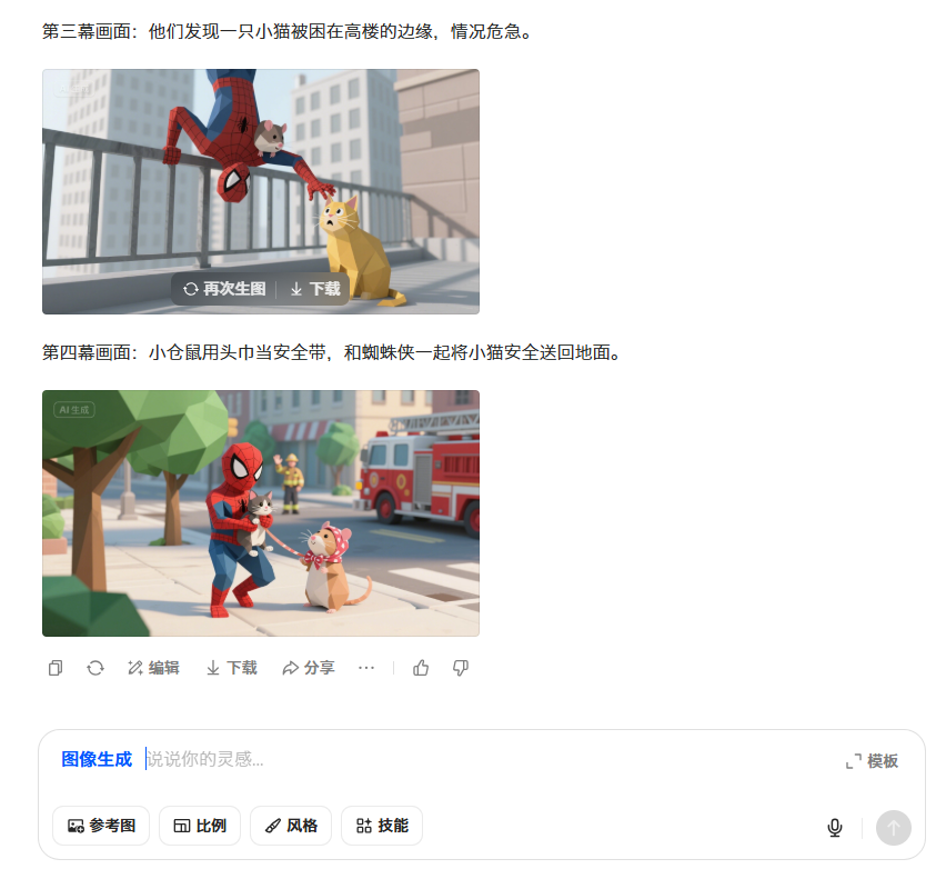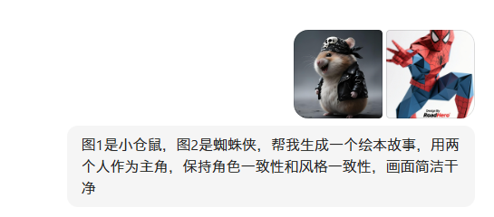 提示词:“图1是小仓鼠,图2是蜘蛛侠,帮我生成一个绘本故事,用两个人作为主角,保持角色一致性和风格一致性,画面简洁干净”。