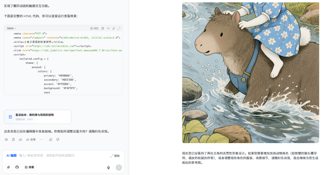 我们也可以先生成人物,再创作绘本故事。在多模态模式下,可以切换到AI编程状态,实现更复杂的任务。