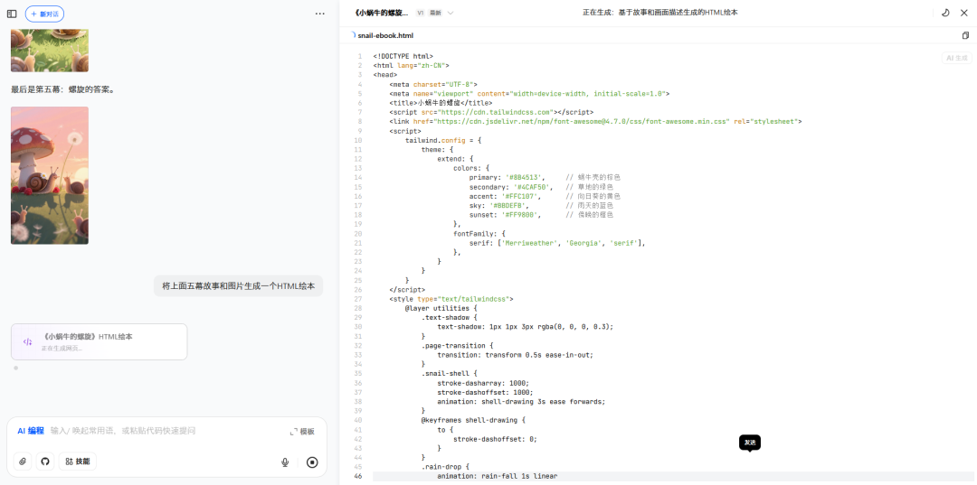 最后,还可以调用AI编程能力,将故事和图片整合,直接生成HTML格式的绘本故事页面。