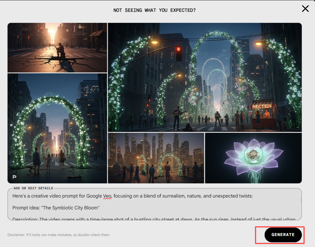 我们将Nano Banana生成的视频提示词复制好,然后切换到Whisk,在输入框中粘贴复制好的提示词。需要注意的是,VEO视频只支持16:9的横屏格式,因此在生成图片前,需要在提示词输入框的右下角切换好视频尺寸。