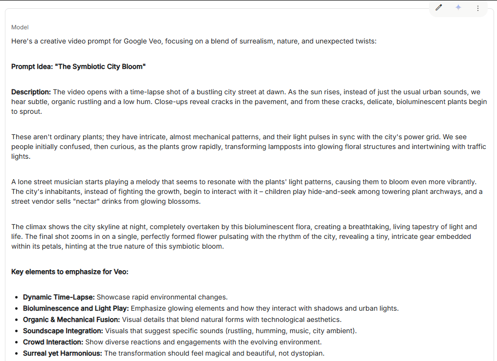 首先,我们打开Google AI Studio,然后选择Nano Banana模型。输入提示词:“give me a creative video prompt for google veo”。