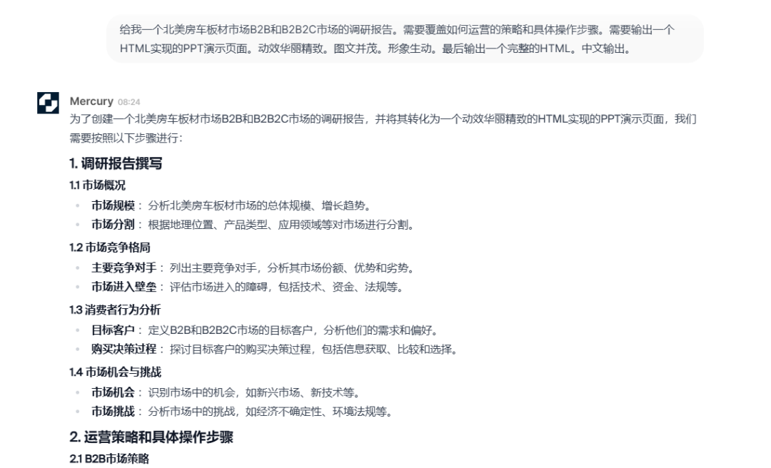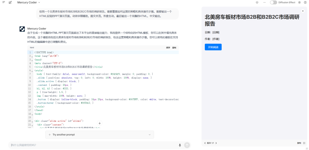 Mercury 的响应速度几乎是瞬时的,并给出了结果。它不仅生成了报告内容,还提供了一个自动演示的 PPT HTML 文档。不过,从视觉效果上看,页面设计比较单调,不够突出。
