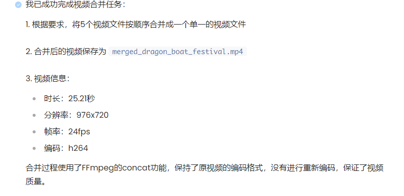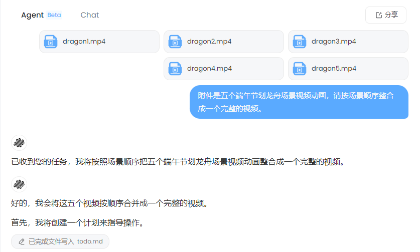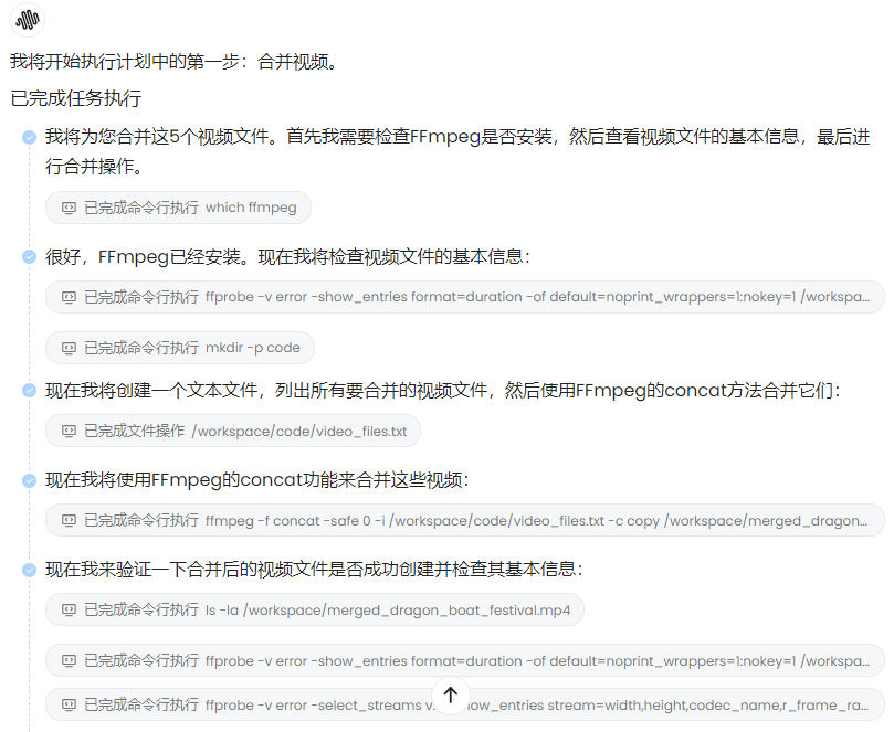 我们可以查看 Agent 的执行过程,了解它是如何理解任务、调用工具并完成视频合成的。