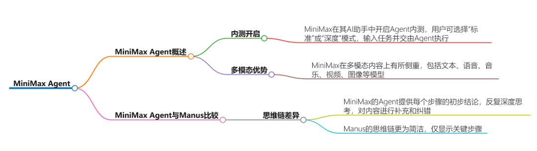 MiniMax Agent 与 Manus 等产品在功能和定位上存在竞争。MiniMax 可能在多模态处理能力和思维链的深度与透明度方面具有其特色和优势。
